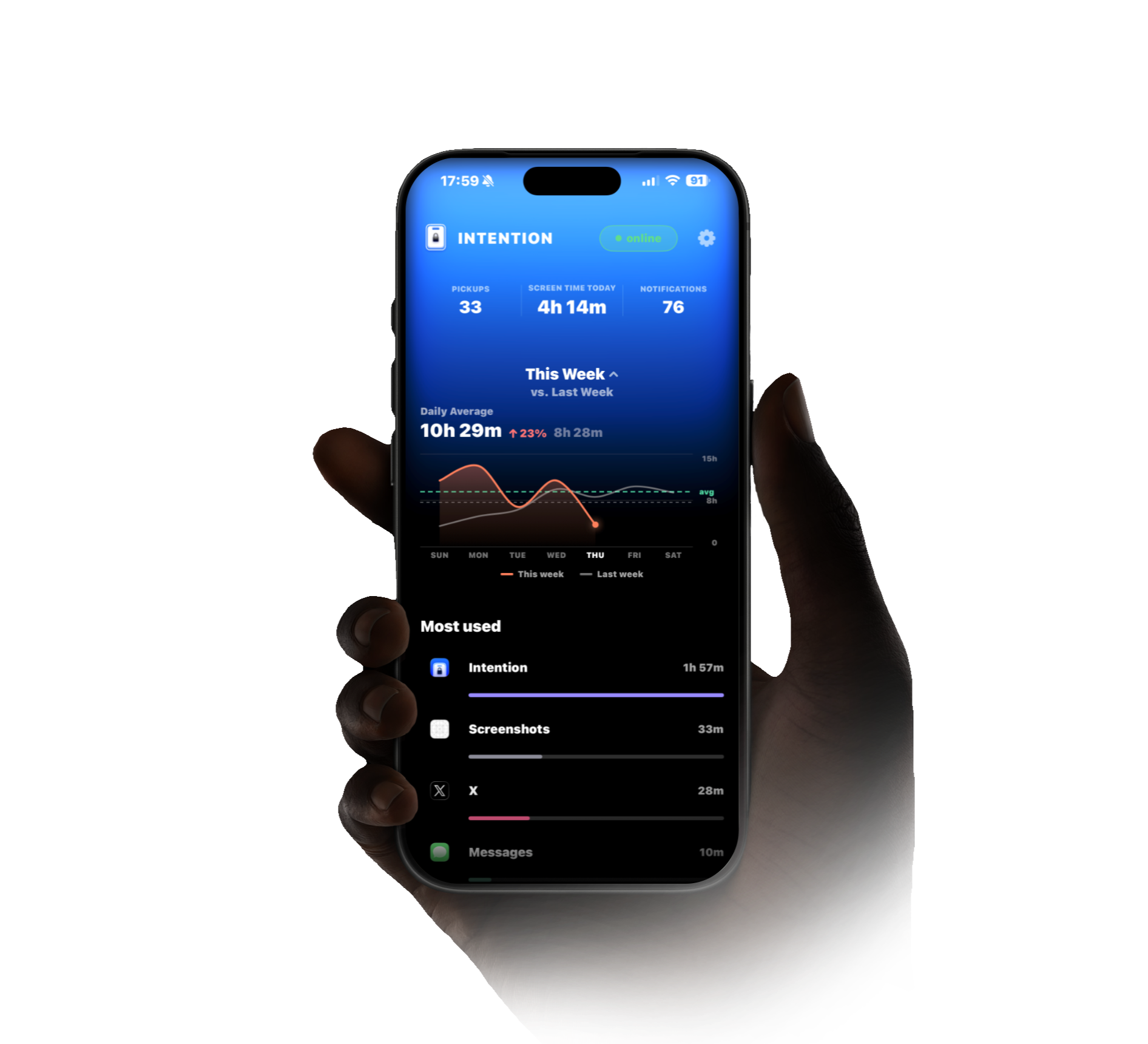 Intention doesn't shame you. It doesn't count your failures. It just asks one question when you open an app: Was this intentional?